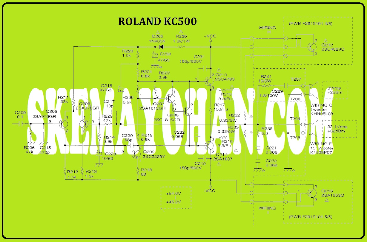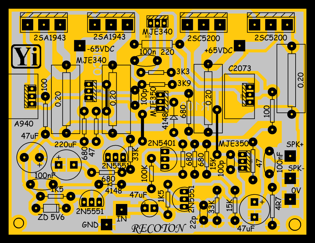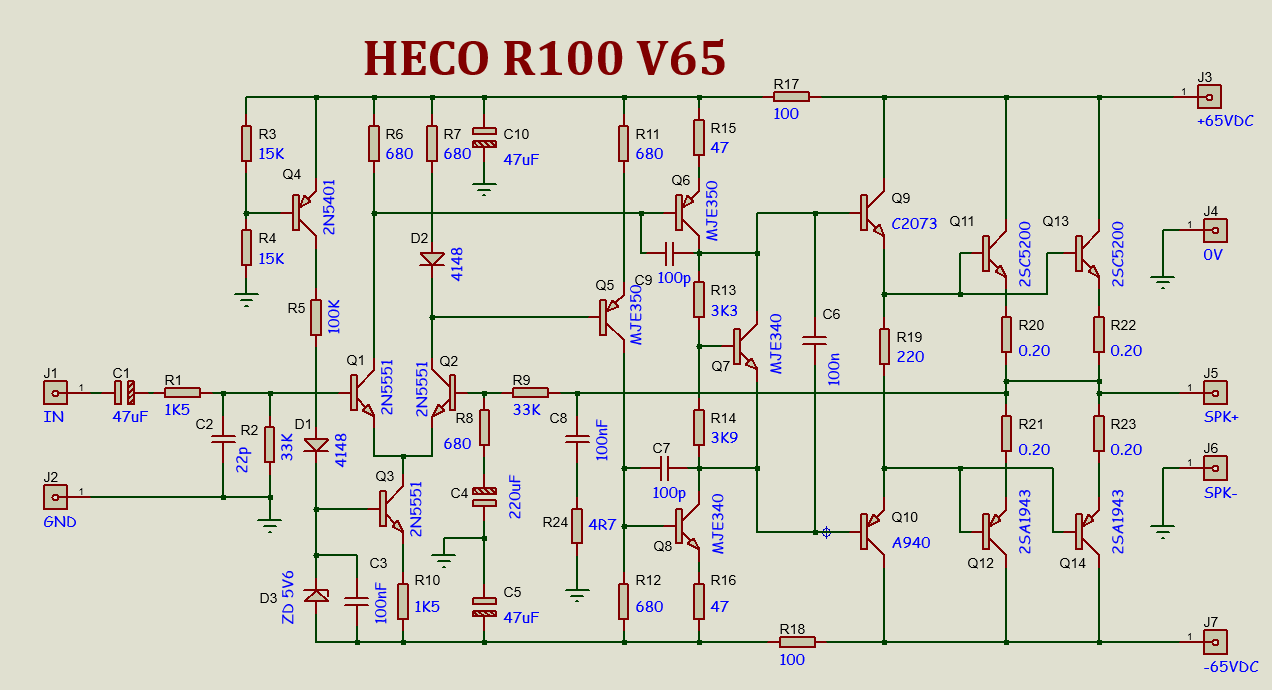 Ini adalah skema hasil modifikasi untuk tegangan supply 65VDC simetris dan menggunakan 2 pasang transistor Final.