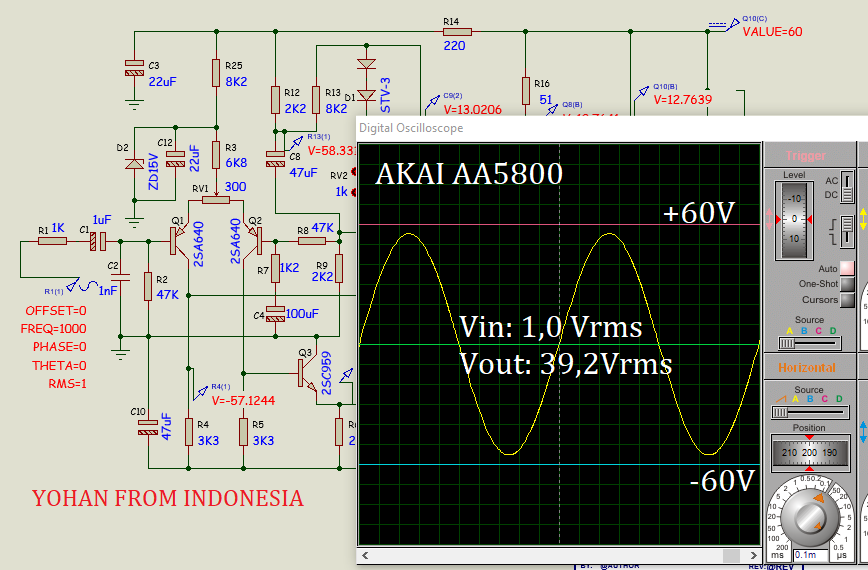 Q5 akan teraliri arus sekitar 5mA dengan menghitung tegangan pada R11 dan R12. Q5 akan menghasilkan dissipasi daya sebesar (61,81+ 62,34) X 5mA = 620mW.