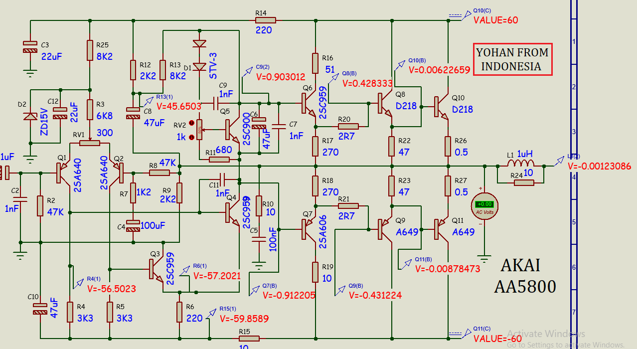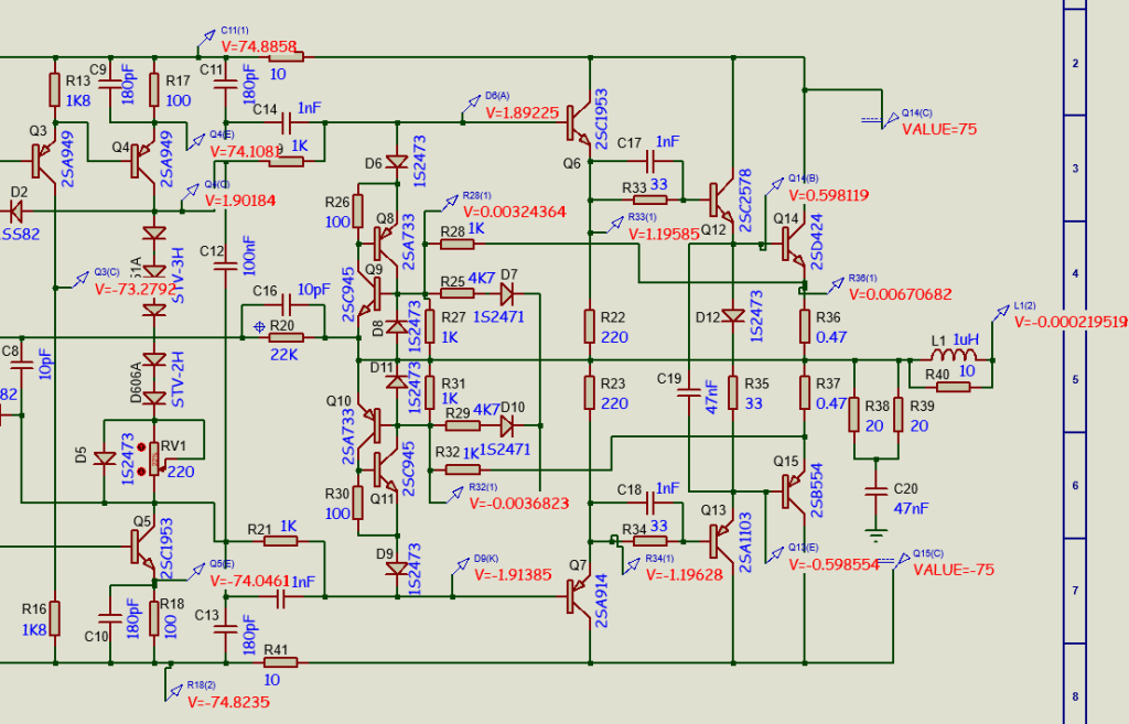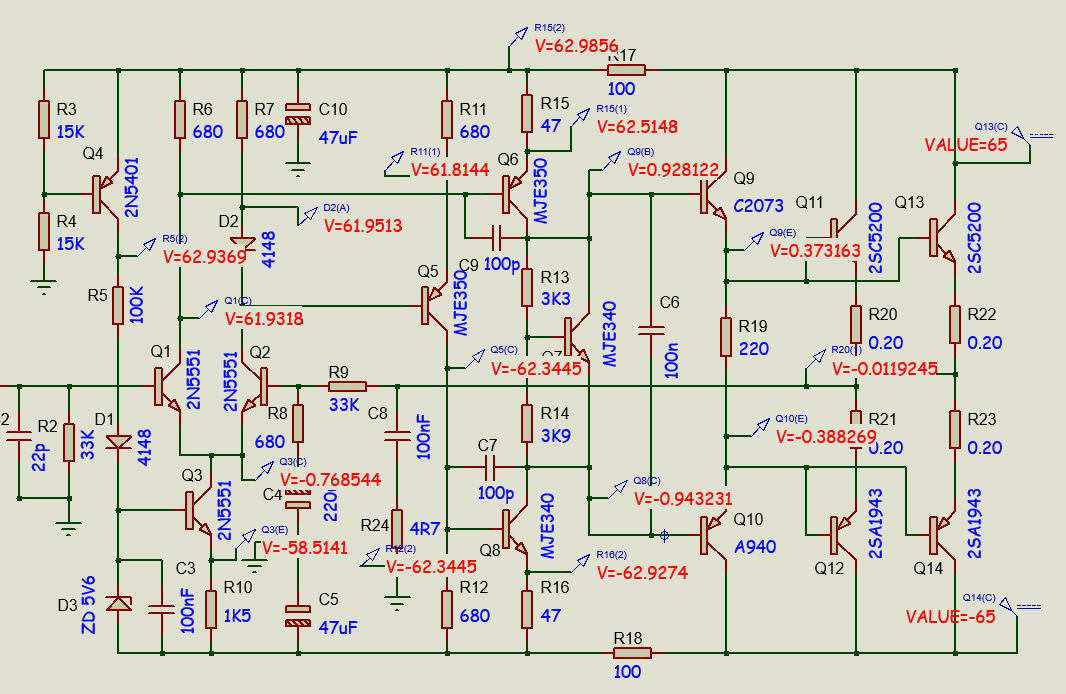 Berikut ini adalah hasil simulasi pengukuran DC pada skema bru yang menggunakan tegangan 65VDC simetris.