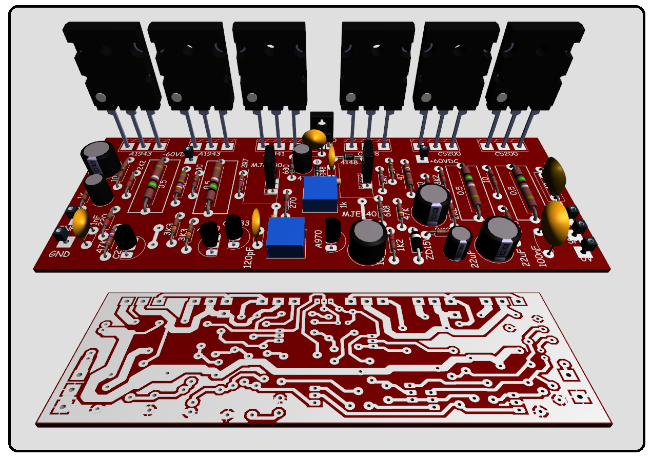 Menggunakan supply dibawah 60V, transistor yang mereka gunakan untuk Final Power adalah pasangan 2SC3281/ 2SA1302 yang memiliki dissipasi daya hingga 150W menurut DATASHEETS.